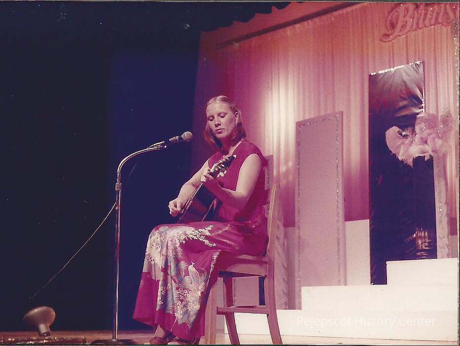 A color photograph of Elizabeth Coffin Lemieux a 1976 contestant playing guitar & singing "Autographs" from John Denver for entertainment.