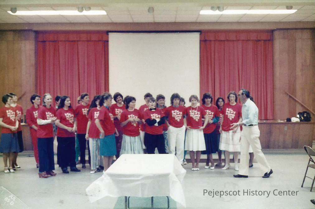 A color photograph of Gene Gagne getting lined up to take a picture with his girls. Showing are: Heidi Heintz, Patty Pickard, Patricia Stuart, Vicky brown, Vanessa Pierce, Donna Burns, Kelley Donovan, Wendy Mercier, Maureen Fortin, Doreen Derosier Kristina Warming, Jane Thiboutot, Elizabeth Coffin, Pat Folger, Doris Bernier and Micheline Phillippon.