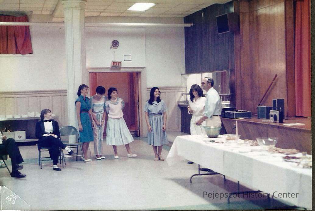 A color photograph of Gene Gagne calling up the past Teen Queens and contestants. They are Jane Thiboutot, Phyllis Gaudreau, Maureen Fortin, Elizabeth Coffin, Pat Folger, Heidi Heintz and Doris Bernier.Lexicon