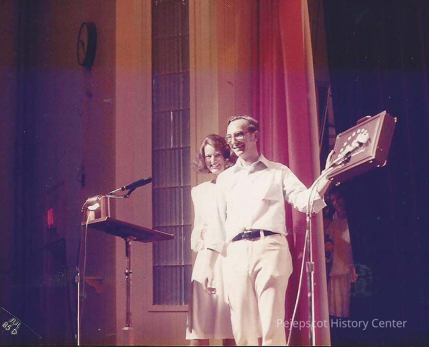 A color photograph of Gene Gagne showing the printing on the briefcase to the audience while Patricia Crooker Mulligan is watching.