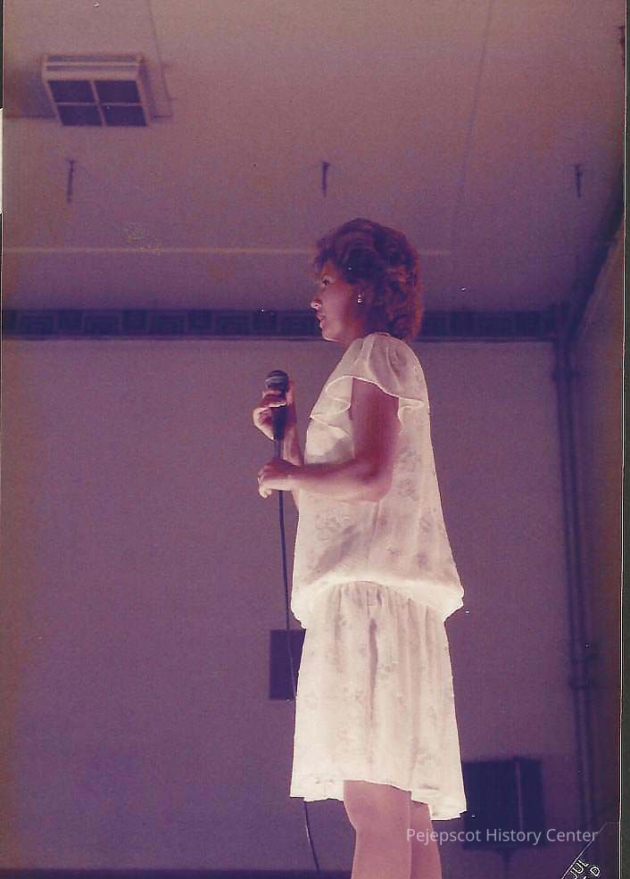 Miss Brunswick Evening Gown Competition A color photograph of Ginger Smith a 1980 Teen Queen contestant singing U. S. A.