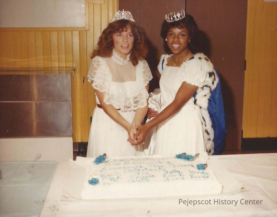 A color photograph of Karen Coombs and Kim Carslick cutting the cake at the reception following the pageant. Photographer's Number 40