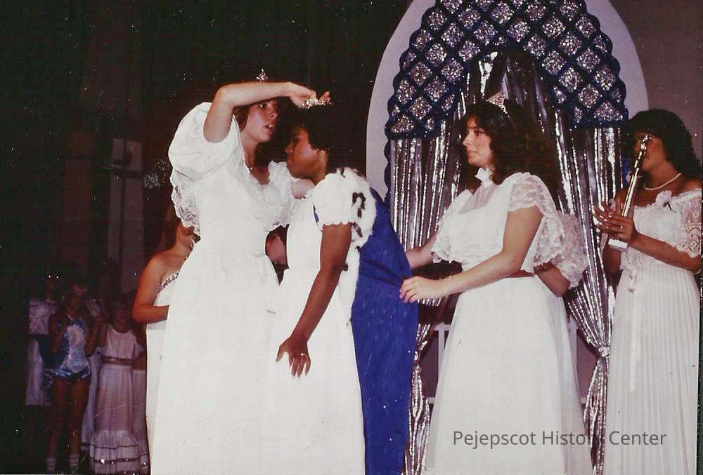 A color photograph of Kathy Walters crowning and Karen Coombs helping with the cape to get Kim Carslick ready for her first walk down the ramp.