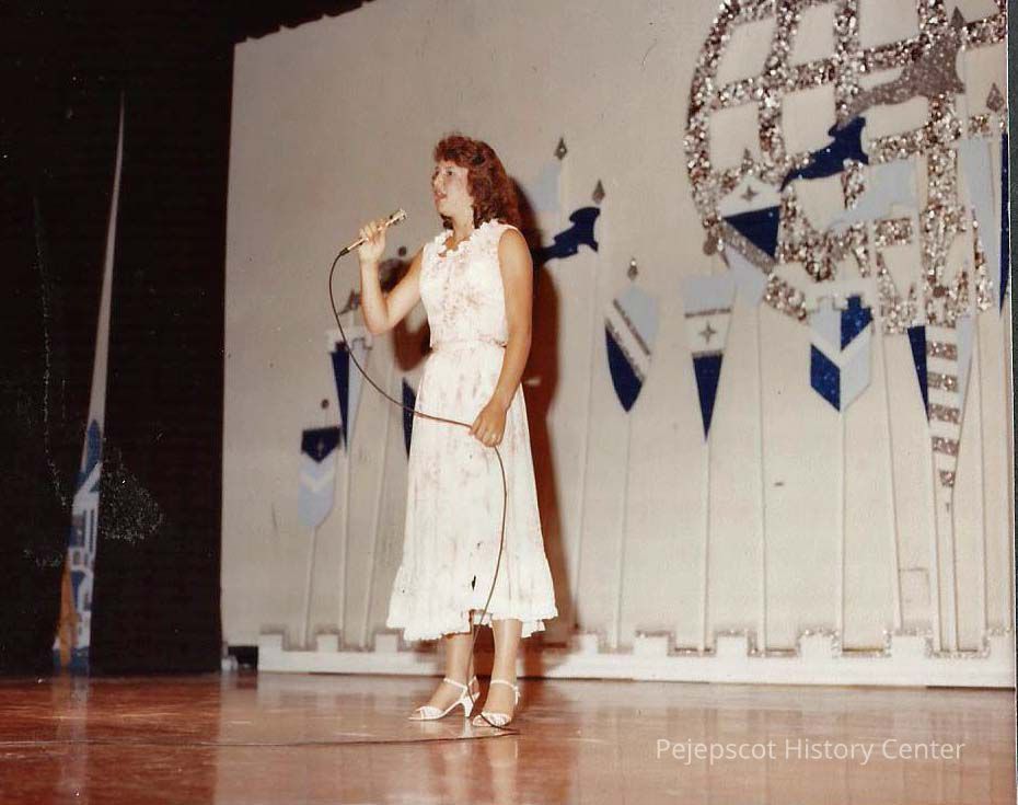 A color photograph of Kim Kenney, contestant #3 singing the popular ballard "Out Here On My Own" from the movie "Fame".