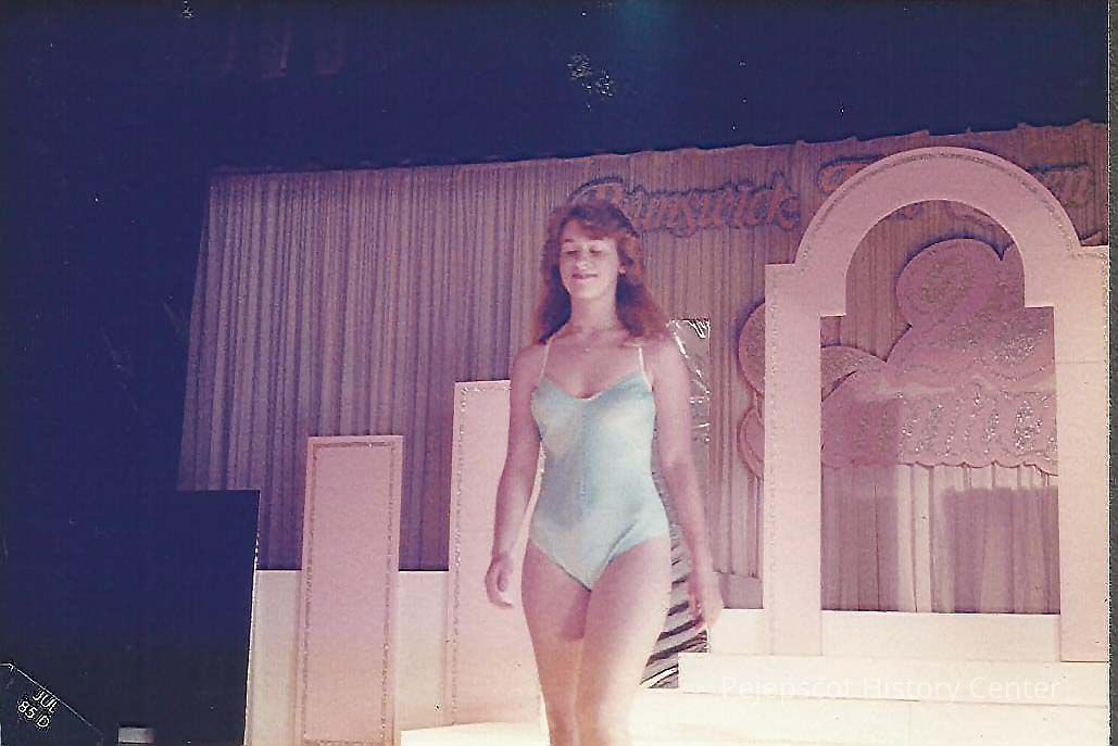 Sunday afternoon June 30,1985 Judging of Swimsuits A color photograph of Miss Brunswick Contestant #1 Vicky Brown in the Swimsuit competition.
