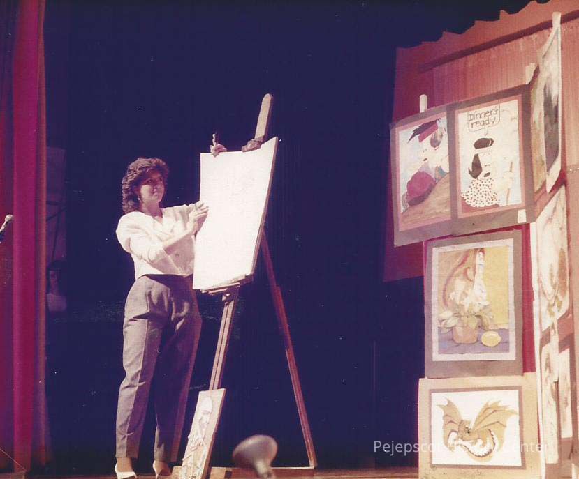 A color photograph of Miss Brunswick Contestant #2 Patricia Stuart presenting her artistic workmanship and displaying some of her work for her talent presentation.