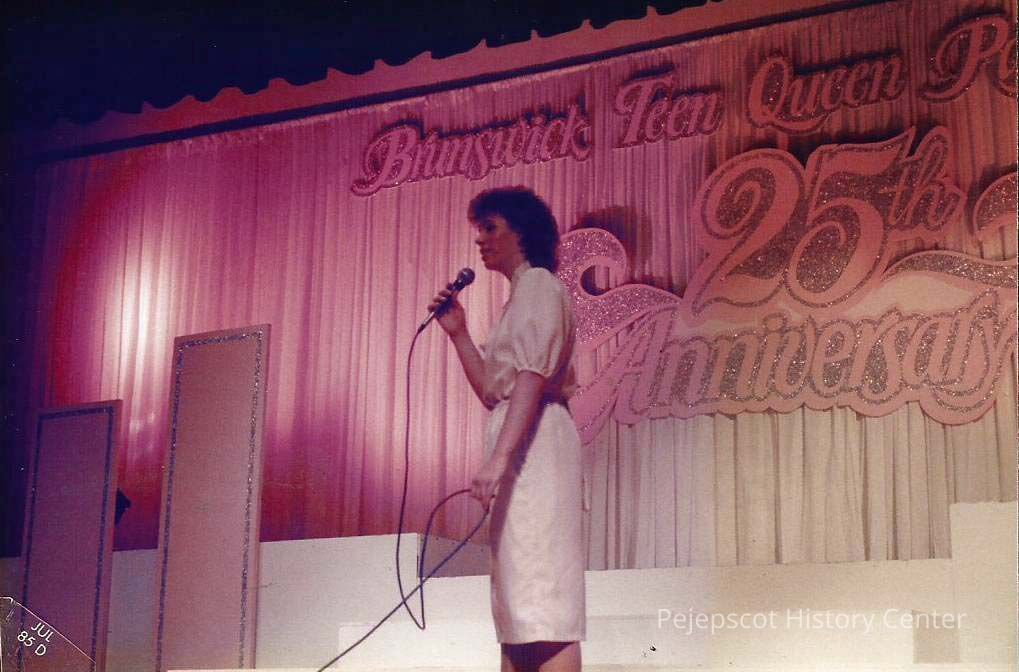 A color photograph of Miss Brunswick Contestant #3 Vanessa Pierce singing John Denver's "Annie Song" for her talent presentation.
