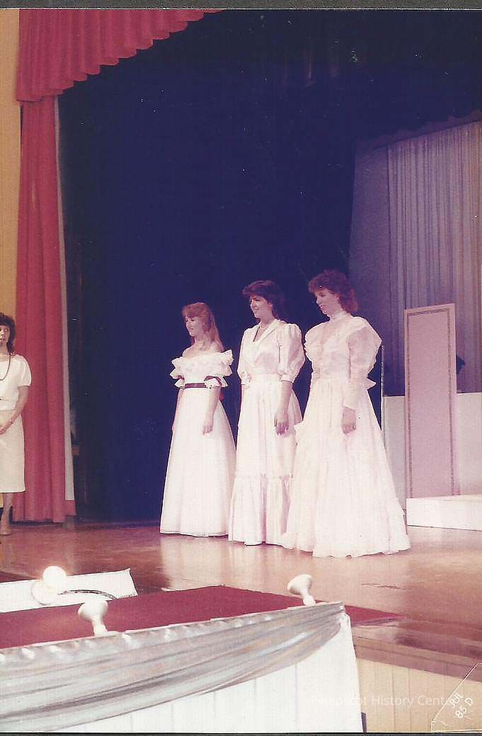 Sunday afternoon Pre-judging of Gowns A color photograph of the Miss Brunswick Contestants being reviewed in a group wearing evening gowns. They are Vicky Brown, Heidi St. Pierre and Patty Pickard. Photographer's number 3-15.