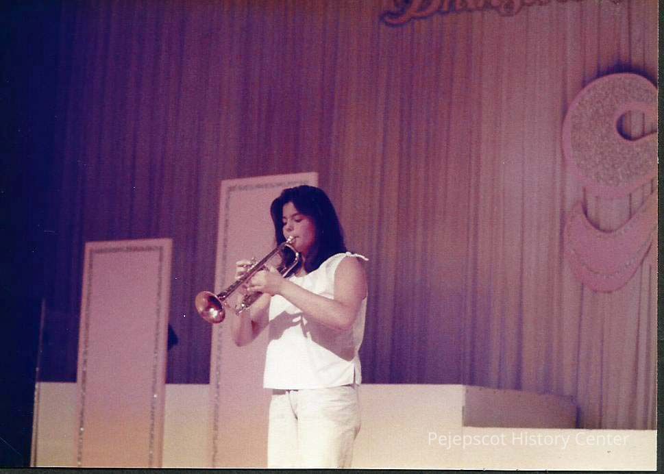 A color photograph of Patty Pickard, Teen Queen Contestant playing her trumpet at dress rehearsal. Photographer's # 1-13