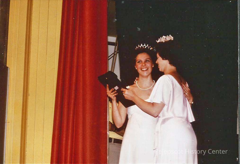 A color photograph of Phyllis (Gaudreau) Glenn receiving the Pageant Dedication from Sharon Hinckley. Photographer's # S-3