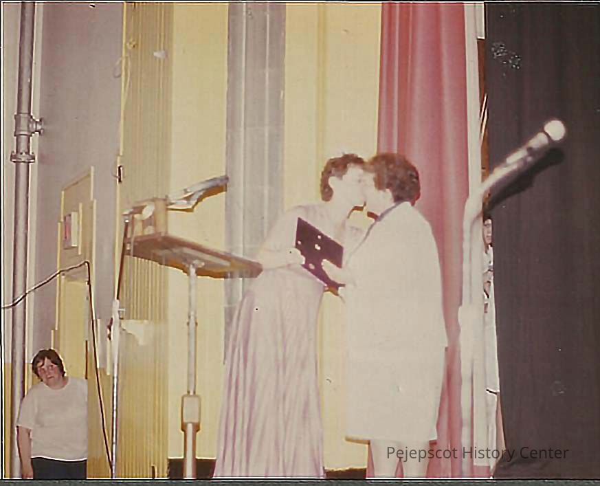 A color photograph of Sharon Hinckley giving Anita Theberge a hug after presenting her with the Teen Queen Pageant Award.
