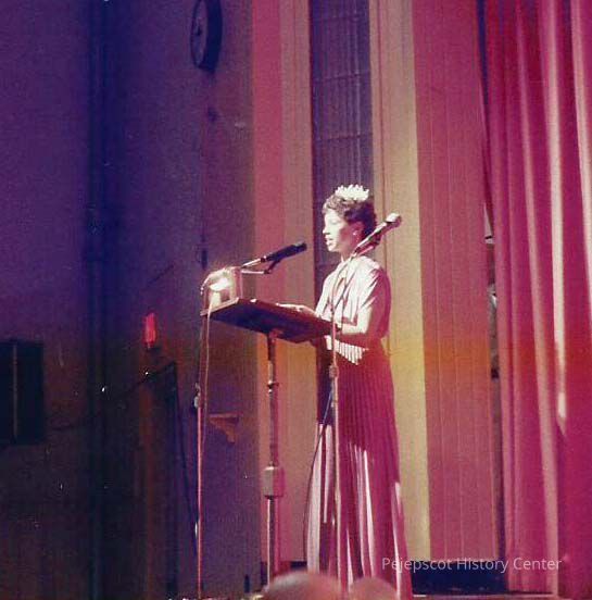 A color photograph of Sharon Hinckley Mistress of Ceremonies opening the 2nd half of the pageant with "A pretty girl is like a Melody".