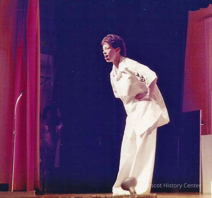 Miss Brunswick Talent Presentation A color photograph of Sharon singing "Honey Bunn" for a comedy routine presented in the 1981 Teen Pageant and brought back for your enjoyment tonight (1985). The routine is from the movie "South Pacific".