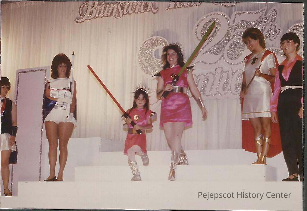 A color photograph of Susan DiEdwardo Gray a 1873 contestant with her daughter Melissa Sue Gray modeling the costume from the 1964 and 1984 pageant opening.
