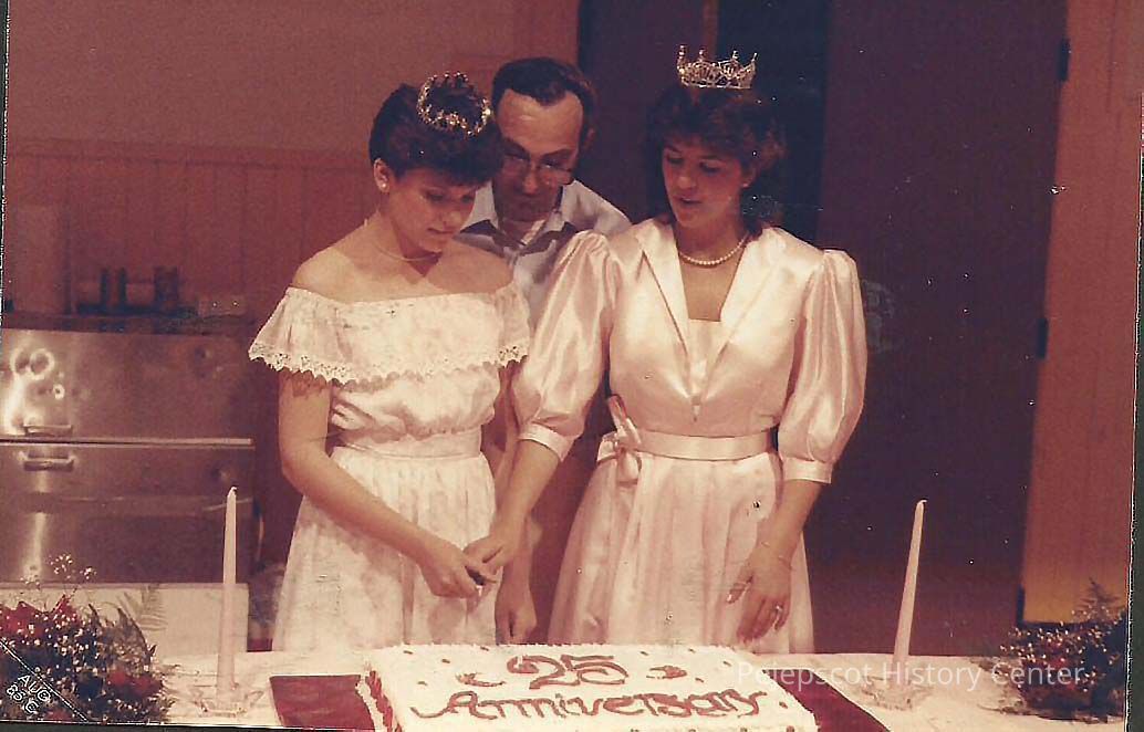 Reception A color photograph of newly elected Teen Queen Beth Wentworth, Miss Brunswick Patricia Stuart cutting the cake while Gene Gagne Pageant Director looks on. Photographers # 6-3.