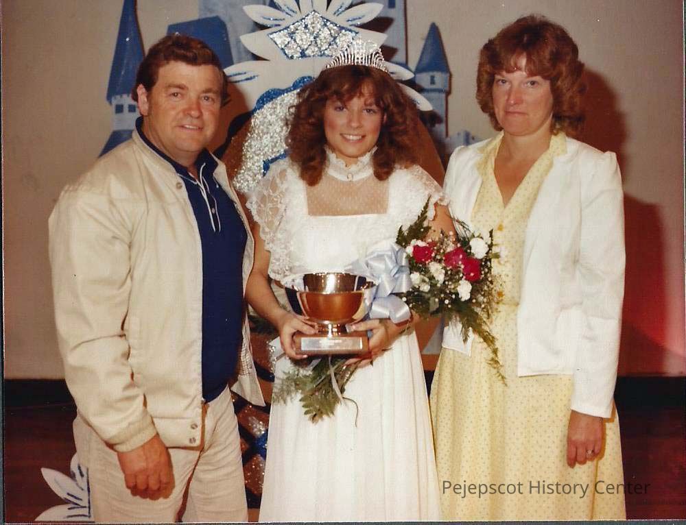A color photograph of the 1983 Miss Brunswick Karen Coombs with her parents Mr. & Mrs. Robert Coombs Photographer's Number 31