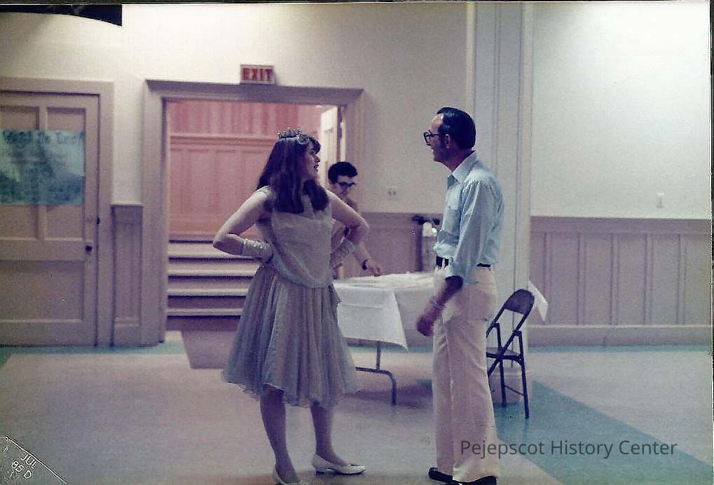 A color photograph of the 25th Anniversary party. The caption on the photograph reads: "Gene (Gagne) telling the Teen Queen Kelley Donovan that we will start the program at 9:00 p.m. with her dance presentation while Richard Gagne is signing in."