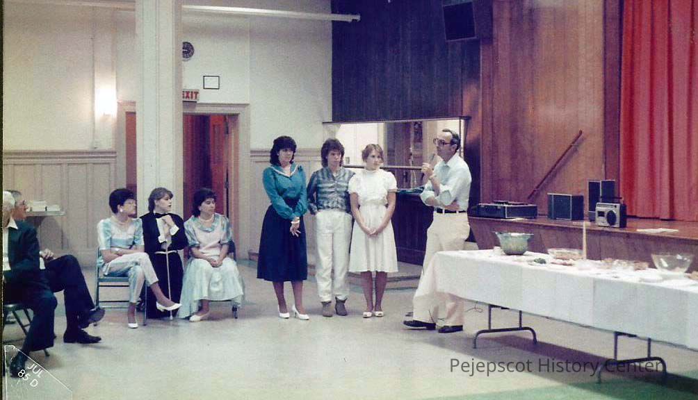 The caption of the photo reads, "Gene (Gagne) telling the audience what these three young ladies would be competing in tomorrow at the pageant. The contestants are Vicky Brown, Vanessa Pierce and Patricia Stuart. Looking on are Wendy (Jane Mercier) Kelly (Donovan) and Elizabeth (Ayers Wentworth)