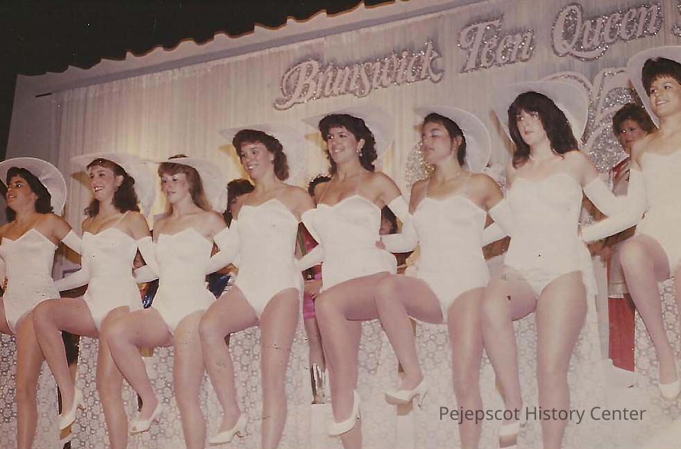 A color photograph of the contestants Wendy Mercier, Doreen Derosier, Vicky Brown, Venessa Pierce, Patricia Stuart, Heidi St. Pierre and Elizabeth Wentworth doing the Follies kickLexicon