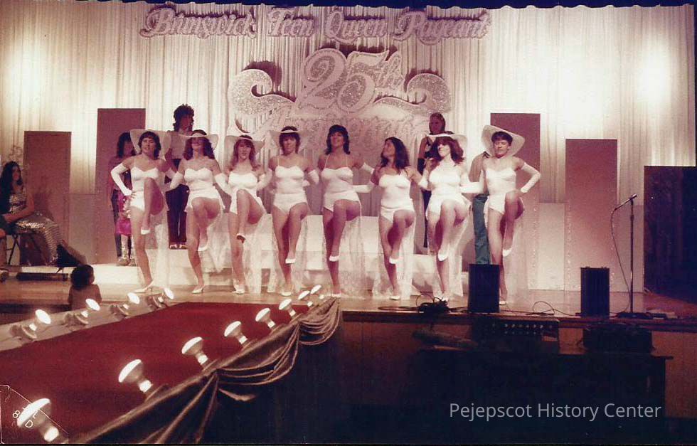 A color photograph of dress rehearsal with L. to R. Wendy Mercier, Doreen Derosier, Vicky Brown, Venessa Pierce, Patty Stuart, Patty Pickard, Heidi St. Pierre and Beth Wentworth. Past contestants are Jane Thiboutot Tondreau, Sue DiEdwardo Gray and daughter Melissa, Mona Abbott St. Pierre and Elizabeth Coffin Lemieux.Lexicon