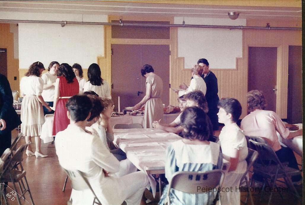 A color photograph of Barbara Brown & Phyllis Gaudreau behind the food table and Doreen Mesier, Heidi Heintz, Patty Pickard, Teen Queen 1960 Micheline Phillippon Lizotte, two of th judges Jan Sidelinger and Cecile Asselin. With the other table of contestants and Judges waiting to go at the buffet table.