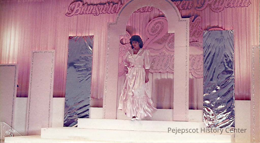 A color photograph of the pre-judging of the Miss Brunswick Contestant #2, Patricia Stuart in evening gown