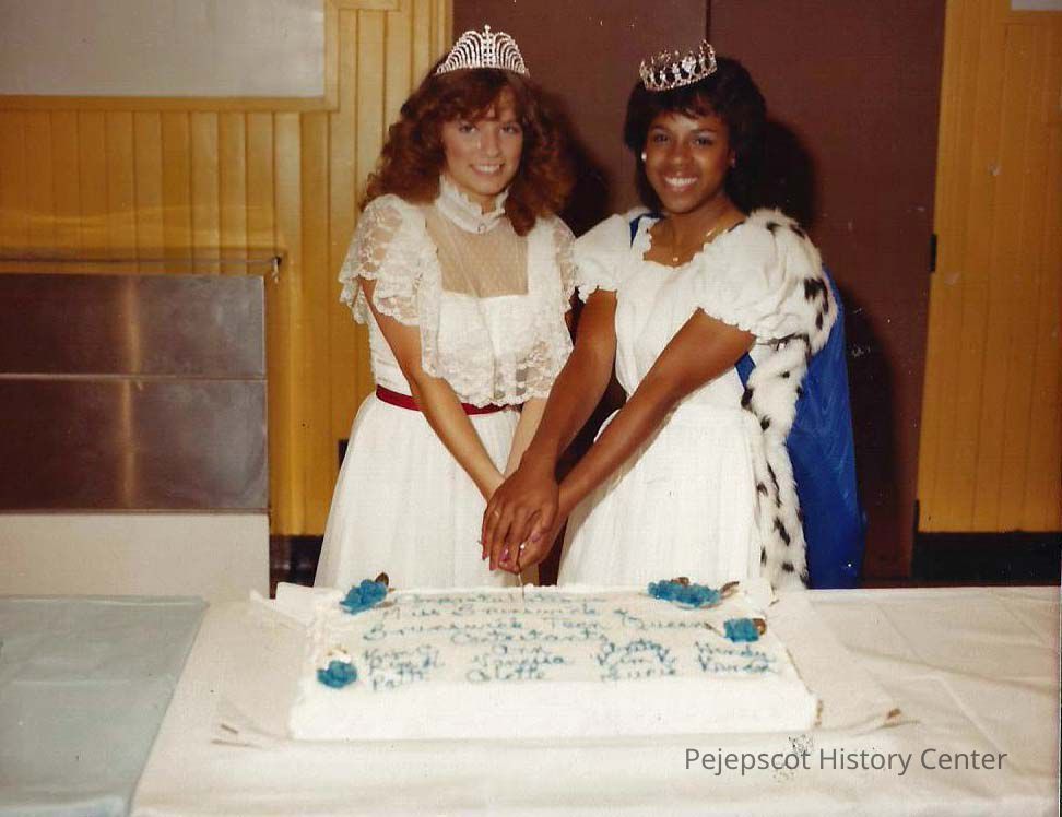 A color photograph of the newly elected Queens Karen Coombs and Kim Carslick cutting the cake at the reception following the pageant.