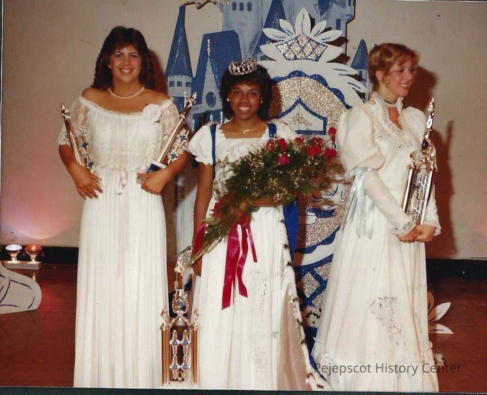 A color photograph of the 1983 Brunswick Teen Queen Kim Carslick and her runners-up. 2nd runner-up Patricia Stuart, Teen Queen Kim Carslick and 1st runner-up Collette Evrard.