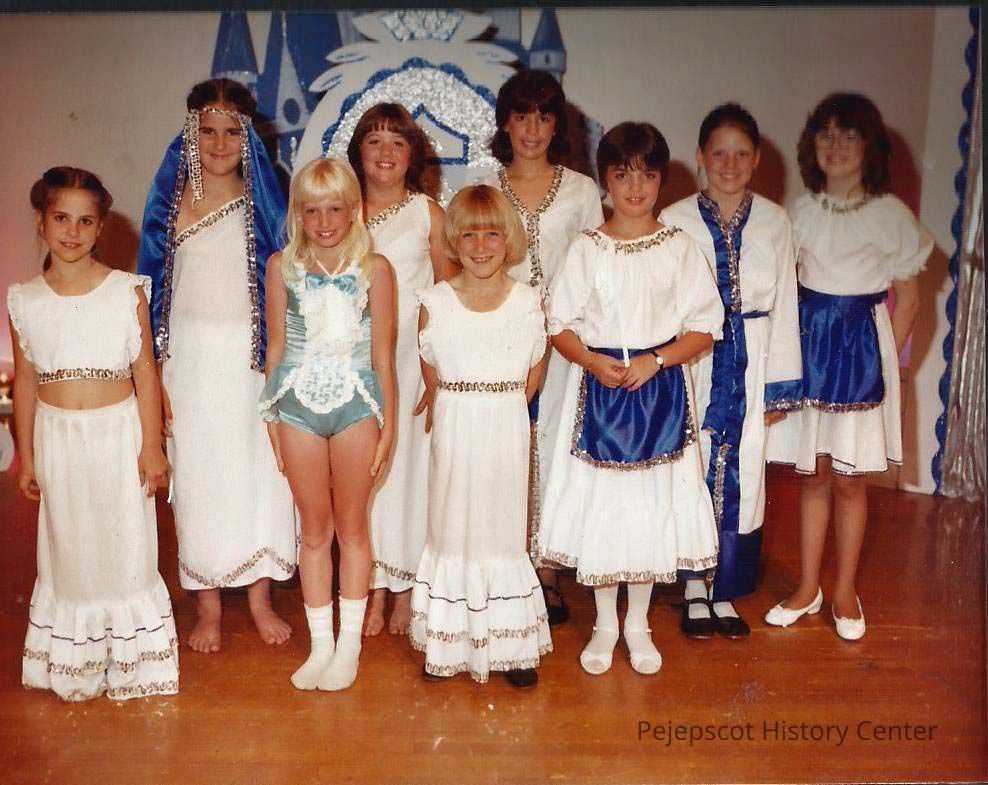 A color photograph of the children portraying the Small World Characters are front row Kerry Coffin, Terri Cook, Lucy Bourgoin and Christine Gagne. Second row are Jean Nourgoin and Michelle Gagne. Second row are Jean Bourgoin, Michelle Gagne, Anita Wright, Stacy Bean and Cindy Oiler.Collection