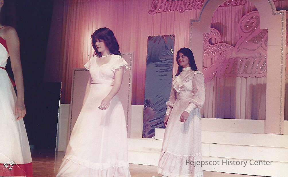 Sunday afternoon June 30,1985 Pre-judging of Gowns A color photograph of the Teen Queen Contestants going down the ramp for a series of quater turns are Heidi St. Pierre and Patty Pickard.
