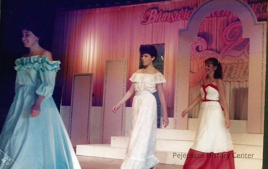 Sunday afternoon June 30,1985 Pre-judging of Gowns A color photograph of the Teen Queen Contestants going down the ramp for there quater turns. They are Wendy Mercier, Elizabeth Wentworth and Doreen Mercier.