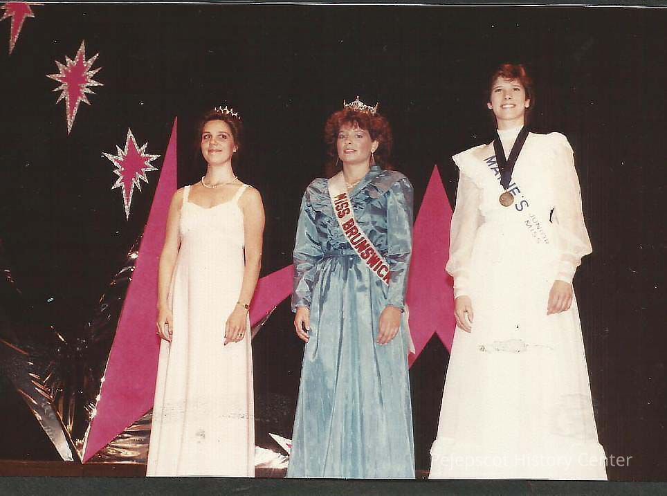 A color photograph of L to R. Phyllis Glenn Teen Queen 1975, Karen Coombs 1984 Miss Brunswick and Tracie Kimball Maine's Jr. Miss 1984