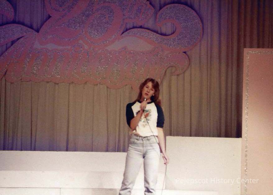 A color photograph of Vicky Brown, Miss Brunswick contestant singing for her talent presentation at dress rehearsal.