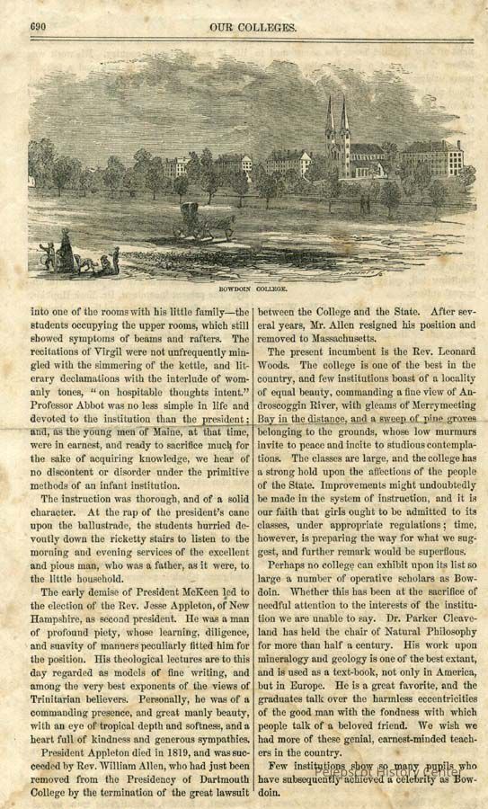 A copy of a page from Emerson's Magazine and Putnam's Monthly, 1857 about the early years of Bowdoin College.