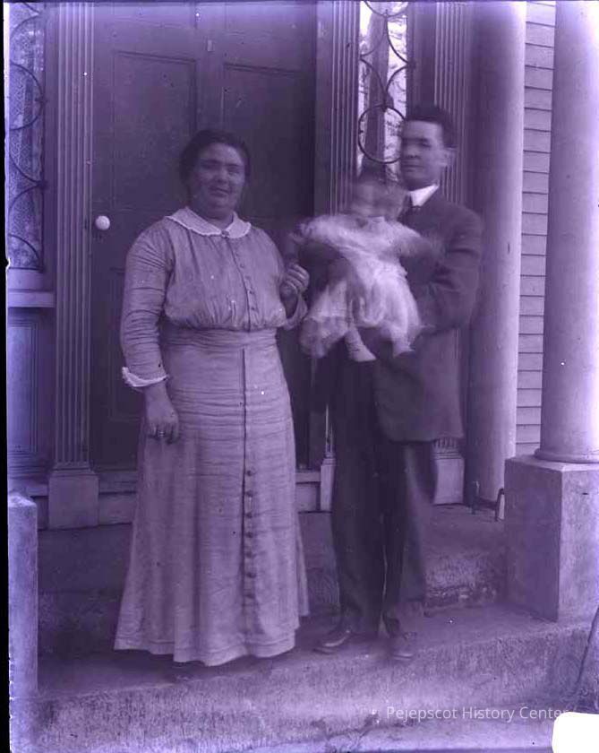 A couple standing in a doorway. The man is holding a baby.