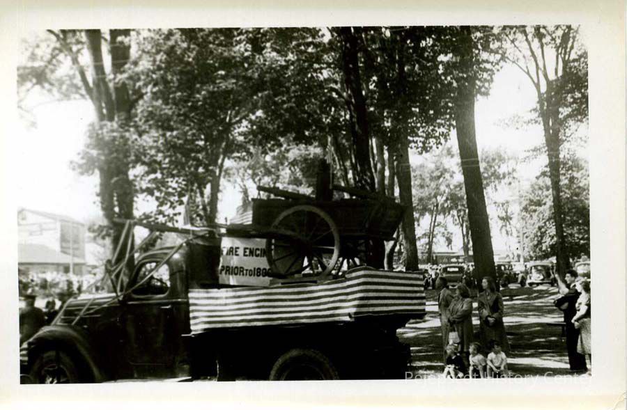 A B/W photograph of the Brunswick Bicentennial parade featuring an old fire engine on a float. Dated 1939.