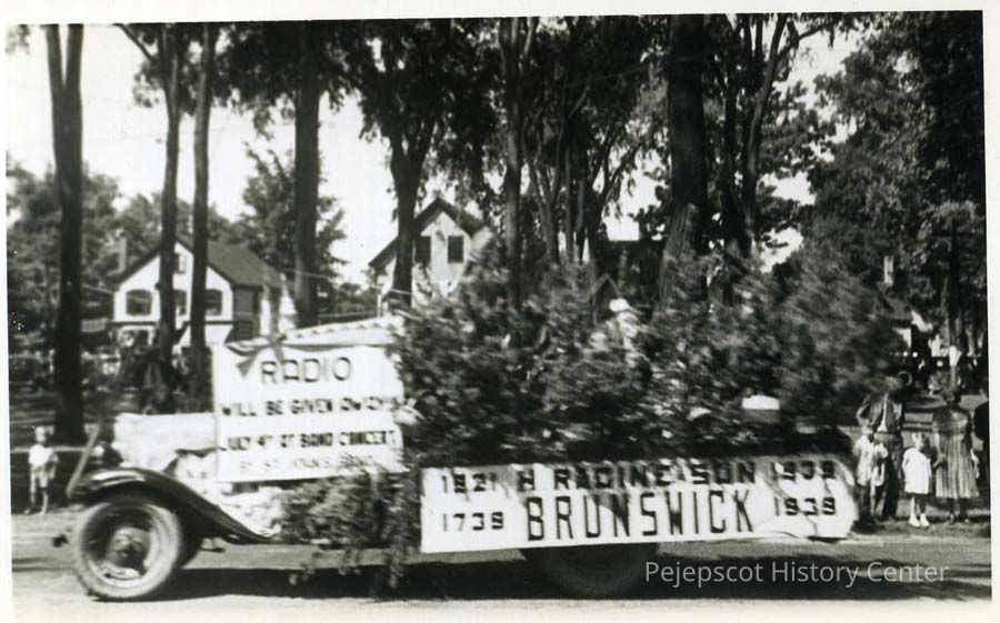 A B/W photograph of a float at the Brunswick Bicentennial parade. The float appears to be for H. Racine and Son. Dated 1939.