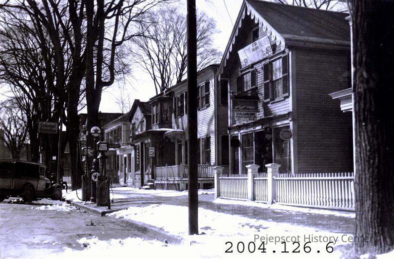 A B/W photograph of a gas station on Maine Street, Brunswick. Sign says "Colonial Gasoline." There is snow on the ground.