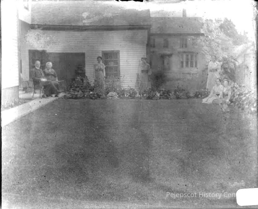 A group of people in front of a house.