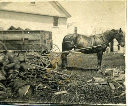 An undated black and white photograph of a horse named "Dick" hauling a wagon filled with firewood at Alvah Thomas's House.