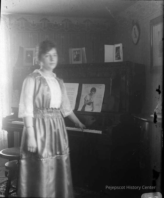 An unknown lady standing by a piano.