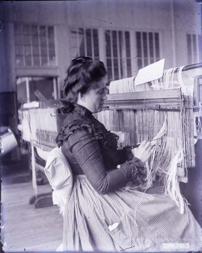 A lady working in a factory. She is sitting and is setting up a loom.