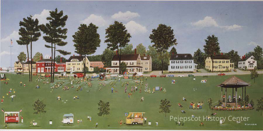 A color lithograph of the Farmer's Market on the Mall. The Skolfield Whittier House and PHS Offices can be seen. It is signed by the artist, Vivian Wixom and is numbered 58/400. 43cm x 28cmLexicon