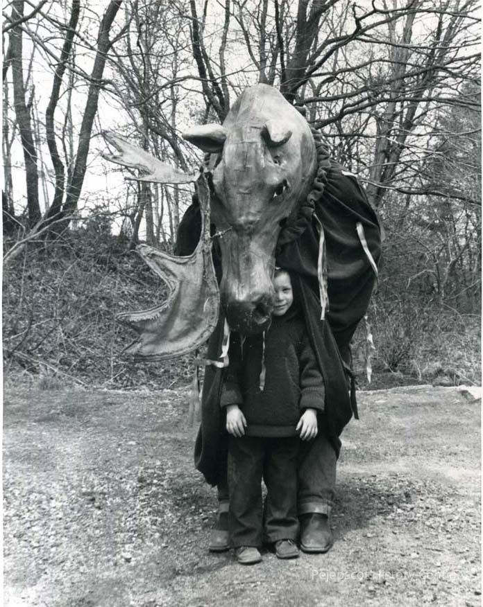 A B/W photo of a little girl playing with someone wearing a moose costume. 4/1980