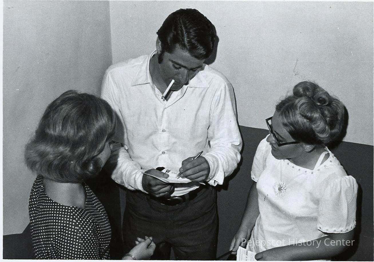 A B/W photograph of a member of the cast of Grease signing autographs.