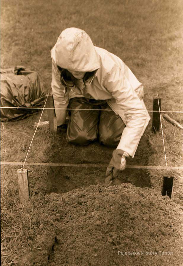 A B/W negative photographic view of a Brunswick Junior High School archeological dig at Maquoit Bay. 5/1979.