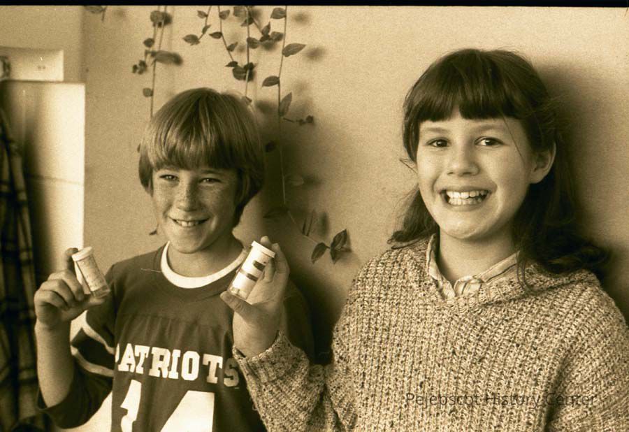 A B/W negative view of Harpswell Island school children who are taking part in the, "Ocean Bottles Project".