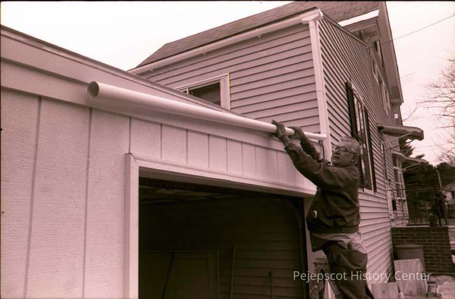 A color negative view of Bill Mcdaye install gutters on a house. 1/16/1989.