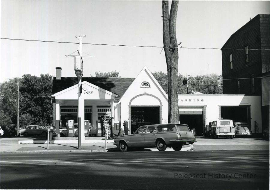 A B/W photograph of 105 Maine St., showing Jenny Service Station. c. 1967