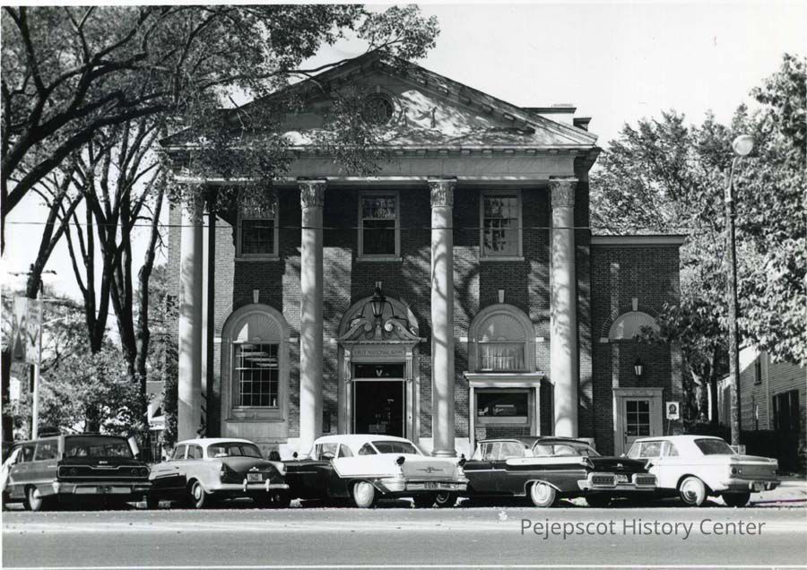 A B/W photograph of 110 Maine St. showing the First National Bank. c. 1967